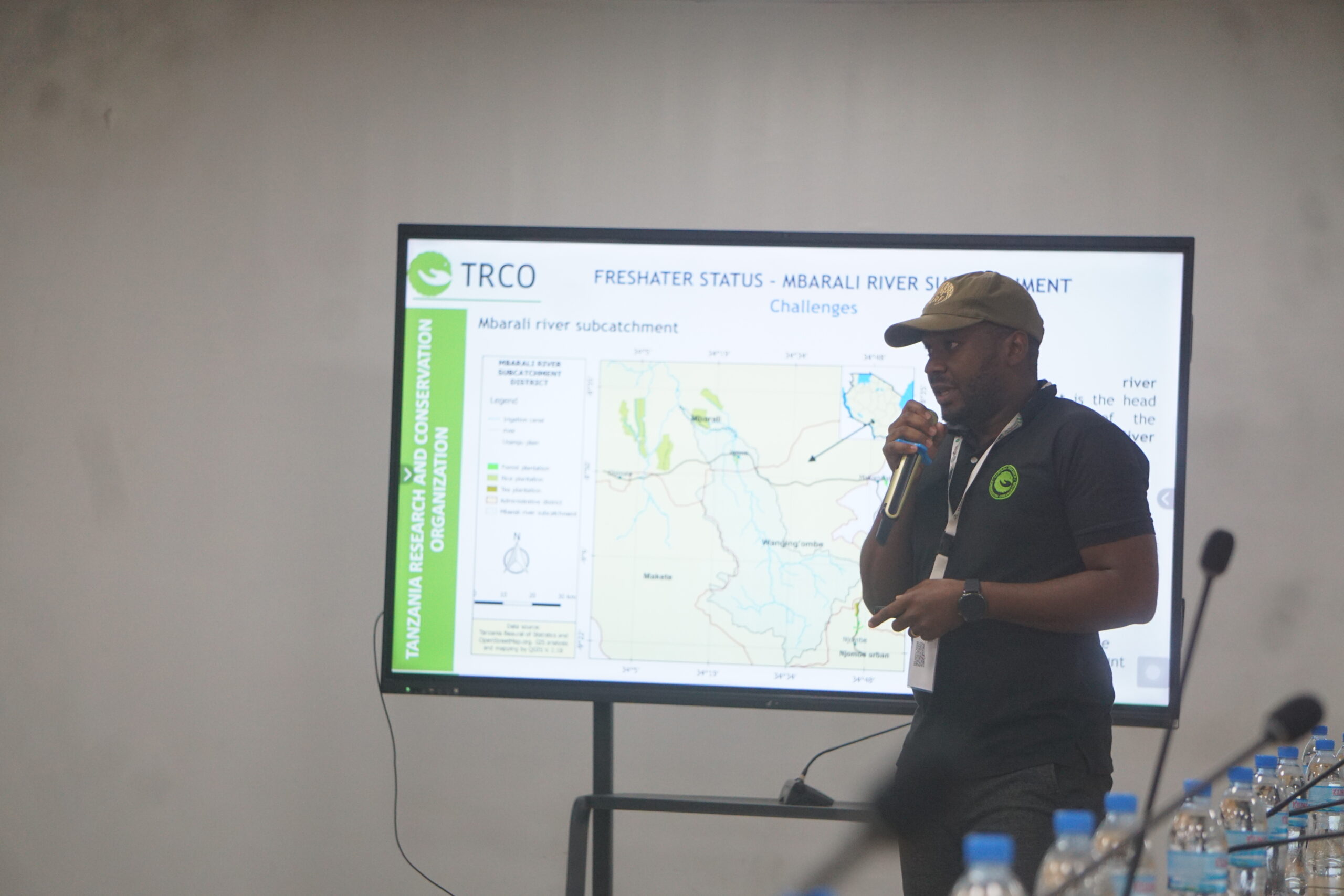 Nyemo Chilagane presenting research on freshwater status and ecosystem resilience in the Mbarali Catchment during the 15th TAWIRI International Scientific Conference. Photo Credit: Hillary Mrosso