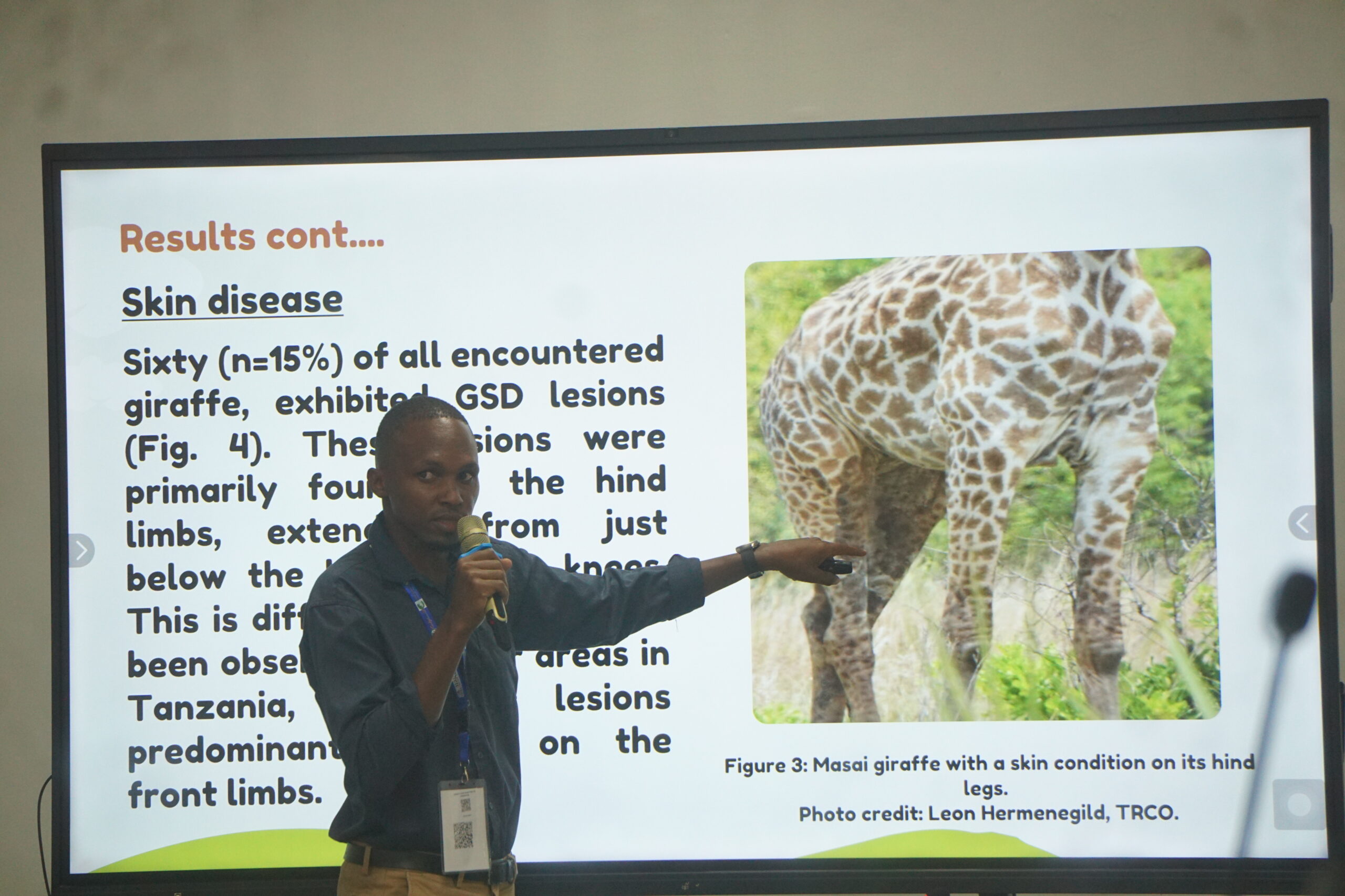 Leon Hermenegild presenting research on giraffe health, highlighting observed skin disease cases in Maasai giraffes during the 15th TAWIRI International Scientific Conference. Photo Credit: Hillary Mrosso