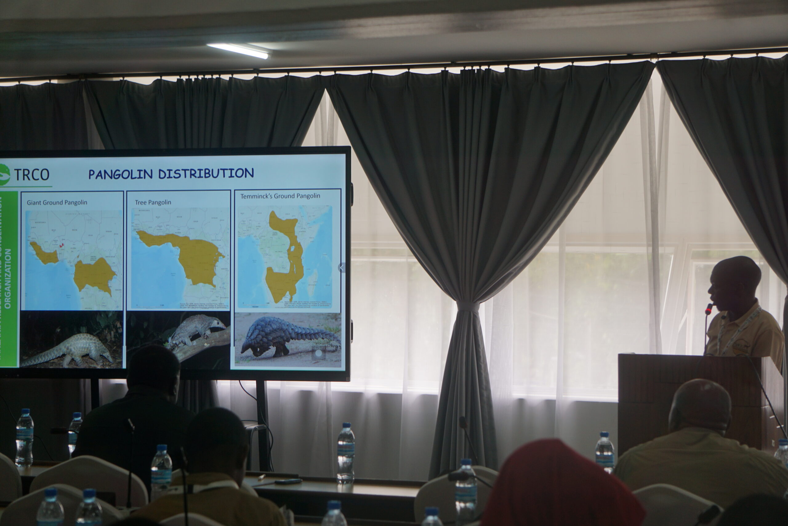 Fenrick Msigwa explaining the distribution of giant ground, white-bellied, and Temminck’s pangolins in Tanzania using the IUCN pangolin distribution map during the 15th TAWIRI International Scientific Conference. Photo credit: Hillary Mrosso