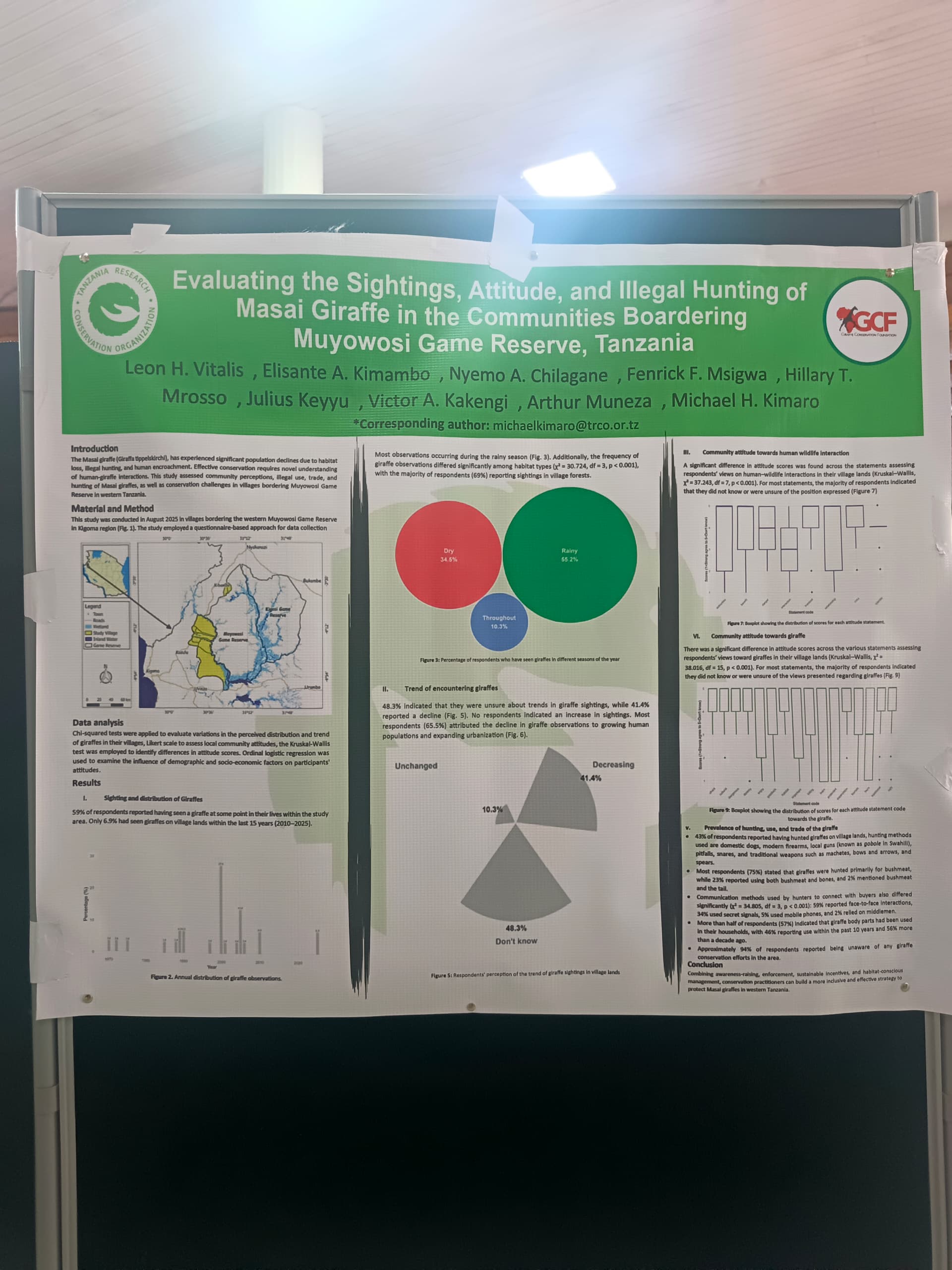 TRCO poster highlighting Maasai giraffe sightings, community attitudes, and illegal hunting pressures in villages bordering Moyowosi Game Reserve, Tanzania, presented during the 15th TAWIRI International Scientific Conference. Photo Credit: Hillary Mrosso