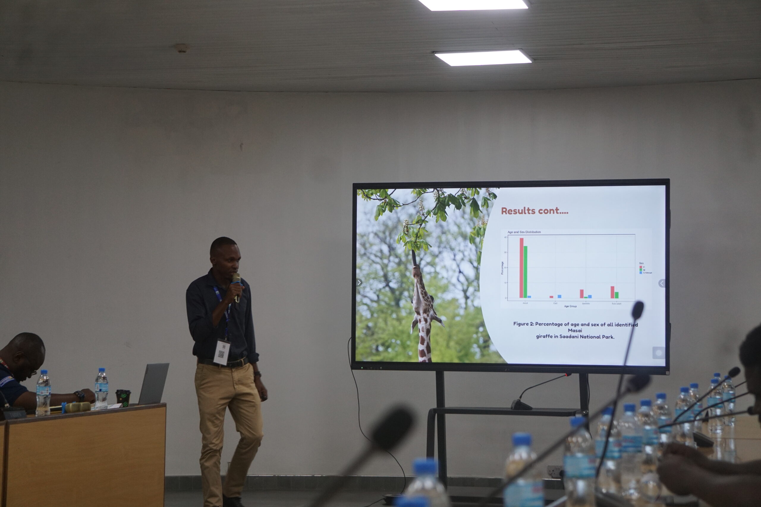 Leon Hermenegild presenting the age and sex structure of identified Maasai giraffes in Saadani National Park during the 15th TAWIRI International Scientific Conference. Photo Credit: Hillary Mrosso
