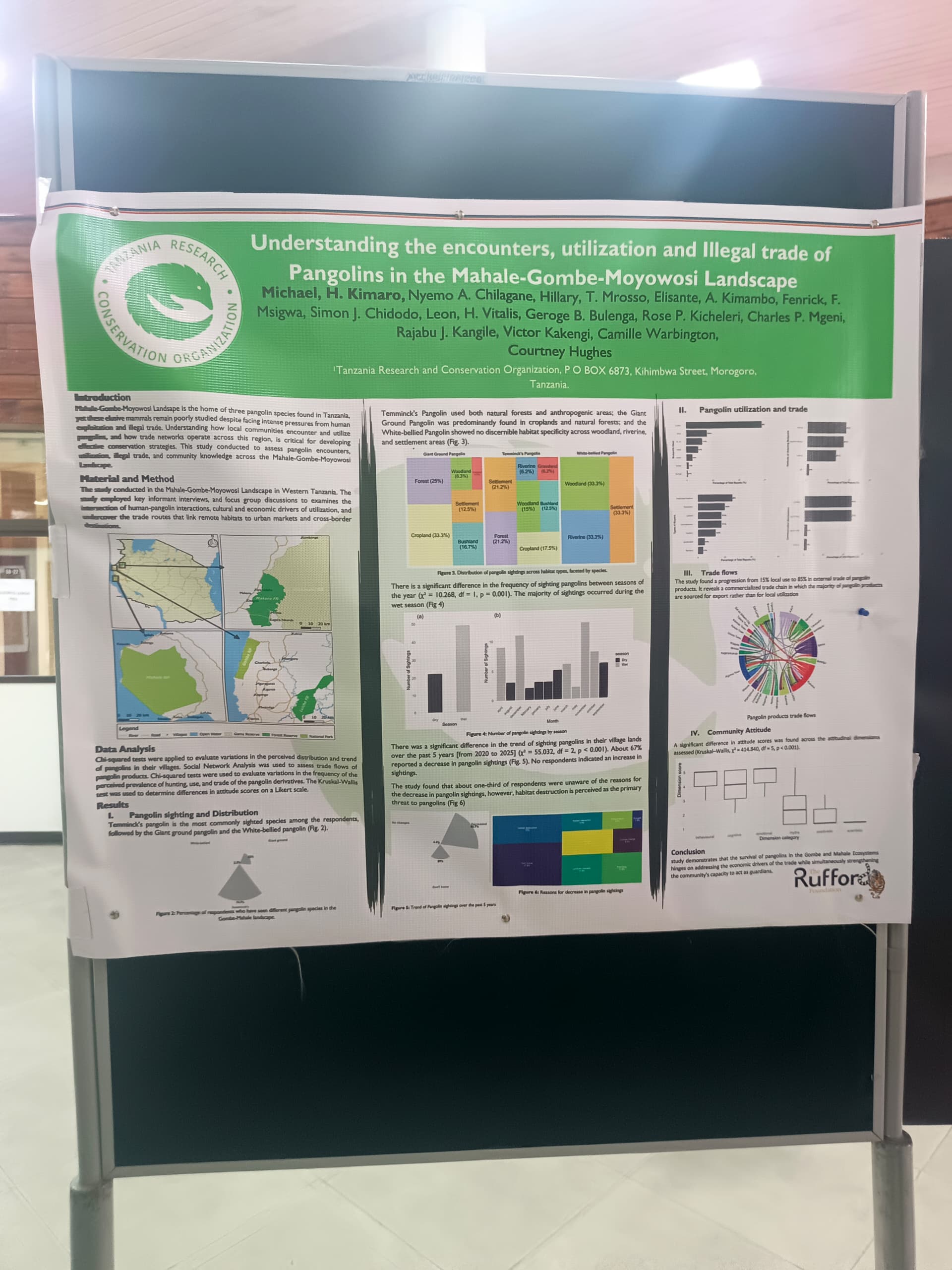 TRCO poster on pangolin encounters and illegal trade in the Mahale–Gombe–Moyowosi landscape, presented at the 15th TAWIRI Scientific Conference. Photo Credit: Hillary Mrosso.