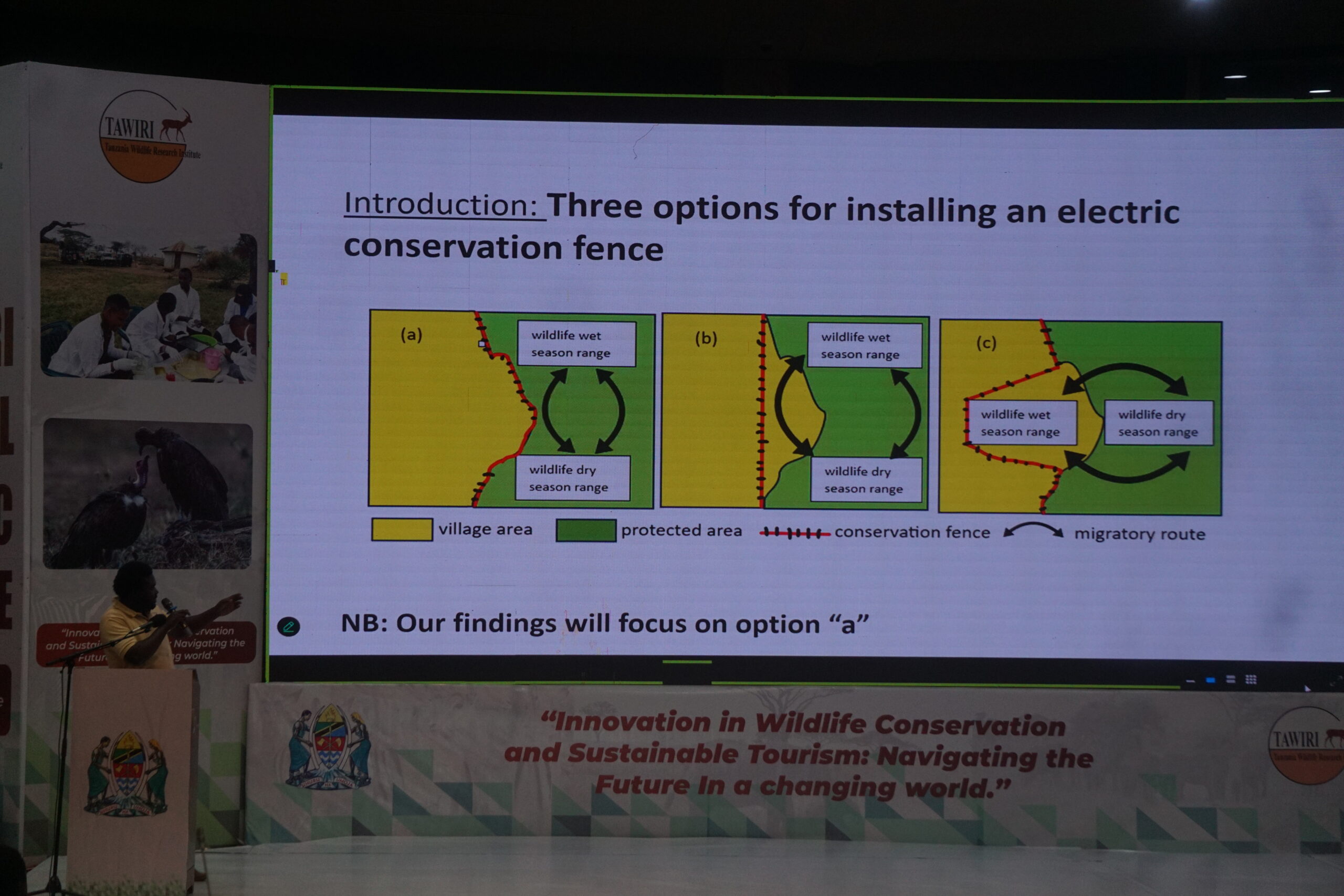 Michael Kimaro sharing research on the impacts of conservation fencing on large mammals during the 15th TAWIRI Scientific Conference.